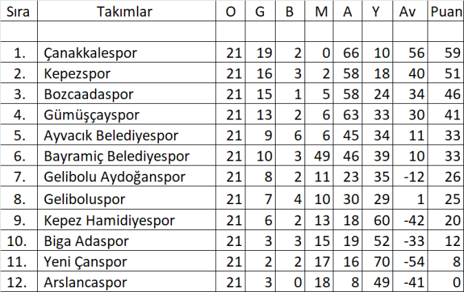 Çanakkale Süper Amatör Lig 21.Hafta Puan Durumu: