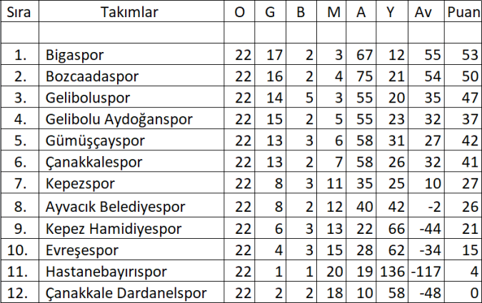 Çanakkale Süper Amatör Lig 22.Hafta Puan Durumu: