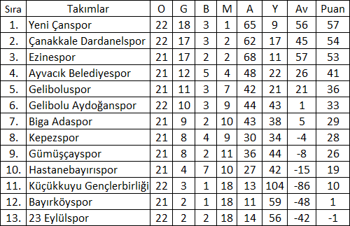 Çanakkale Süper Amatör Lig 23.Hafta Puan Durumu:
