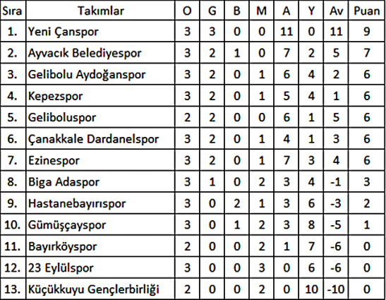 Çanakkale Süper Amatör Lig 3.Hafta Puan Durumu: