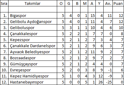 Çanakkale Süper Amatör Lig 5.Hafta Puan Durumu: