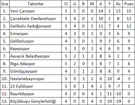 Çanakkale Süper Amatör Lig 5.Hafta Puan Durumu: