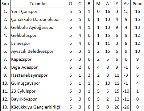Çanakkale Süper Amatör Lig 6.Hafta Puan Durumu: