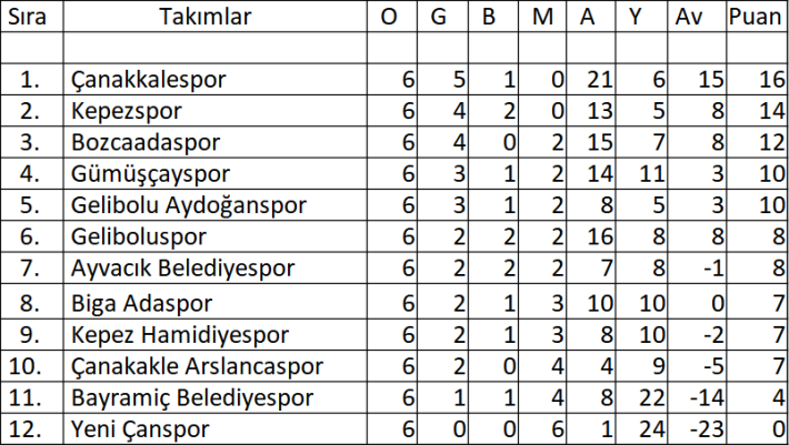 Çanakkale Süper Amatör Lig 6.Hafta Puan Durumu: