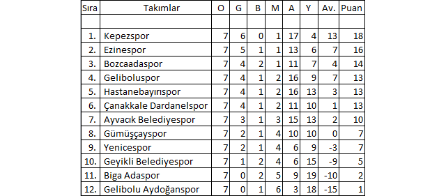 Çanakkale Süper Amatör Lig 7.Hafta Puan Durumu: