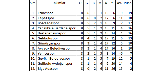 Çanakkale Süper Amatör Lig 8.Hafta Puan Durumu: