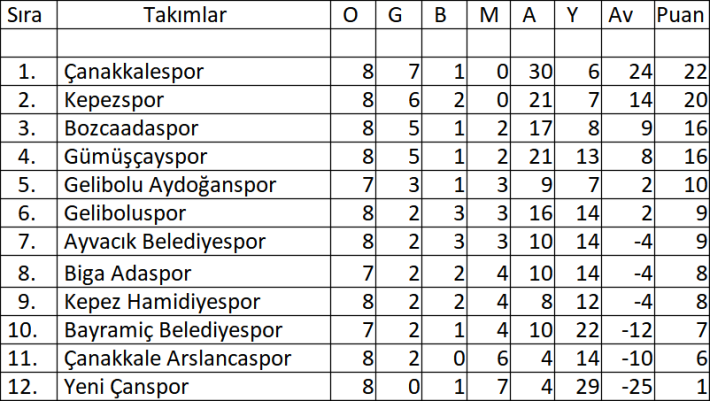 Çanakkale Süper Amatör Lig 8.Hafta Puan Durumu: