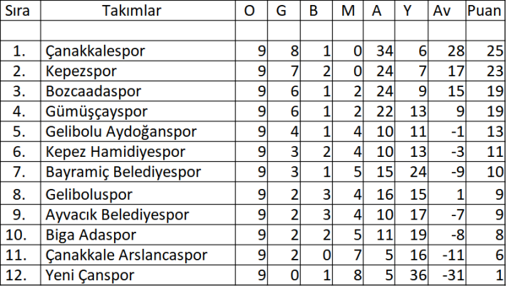 Çanakkale Süper Amatör Lig 9.Hafta Puan Durumu: