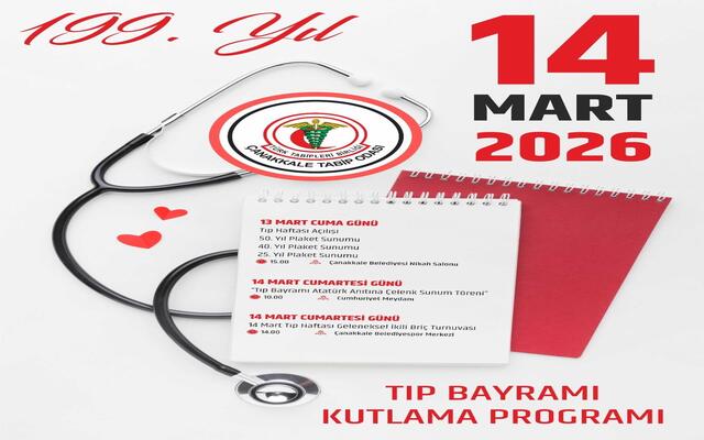 Çanakkale Tabip Odası, modern tıp eğitiminin başlangıcının 199. yılında “14 Mart Tıp Bayramı” dolayısıyla kapsamlı bir kutlama programı hazırladı. Etkinlikler, plaket törenlerinden briç turnuvasına kadar geniş bir yelpazede gerçekleştirilecek.