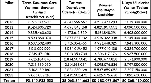 Buna göre 2012-2022 yılları arasında Türk Çiftçisine ödenmesi gereken toplam destek miktarı 93.2 milyar dolar olması gerekirken, ödenen destek miktarı 38 milyar dolarda kalmıştır. Yani 2012-2022 yılları arasında 55.1 milyar dolarlık destek ödenmemiştir. Buna karşılık 2012-2022 yılları arasında yurtdışında yaşayan yabancı vatandaşların refahını artırmak için 80.2 milyar dolarlık yardım yapılmıştır. Bu durum hükümet nezdinde desteğe ve yardıma ihtiyacı olan Türk çiftçisinin ötelendiğinin veya önceliğinin olmadığının göstergesidir.