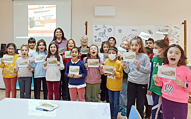 Usta sanatçı, katılımcı çocuklar için kendi özgün Troia desenleriyle bezenmiş bir anı kartı da imzaladı. Çocukların yoğun ilgi gösterdiği buluşma, kentin önemli değerlerinden Göksel Sevim’e Çanakkale Belediyesi adına çiçek takdimi ve toplu fotoğraf çekimi ile sona erdi.