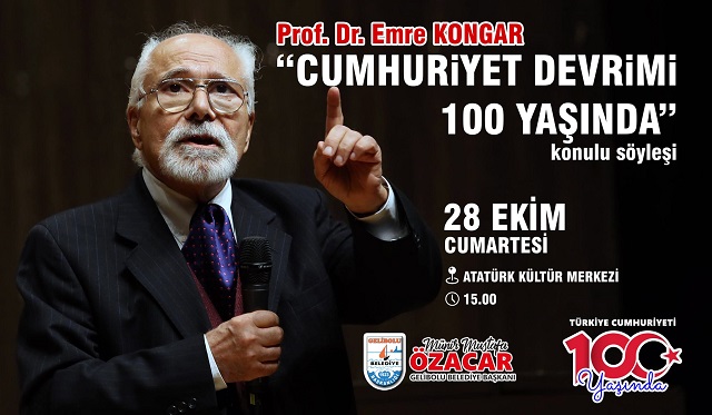 Cumhuriyetimizin 100. Yılı kutlama etkinlikleri kapsamında Gelibolu’ya gelecek olan Prof. Dr. Emre Kongar, “Cumhuriyet Devrimi 100 Yaşında” konulu söyleşi ile 28 Ekim 2023 – Cumartesi günü Gelibolu Atatürk Kültür Merkezi’nde olacak.