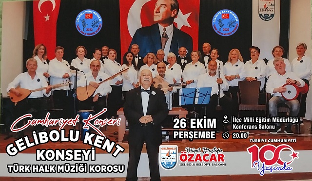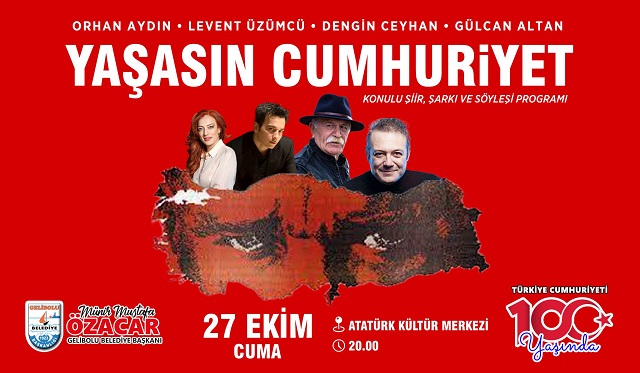 Cumhuriyetimizin kuruluşunun 100. Yılı kutlama etkinlikleri 26 Ekim 2023 – Perşembe günü İlçe Milli Eğitim Müdürlüğü konferans salonunda yapılacak olan Gelibolu Kent Konseyi Türk Halk Müziği Korusu konseri, 27 Ekim 2023 – Cuma günü Gelibolu Atatürk Kültür Merkezi’nde gerçekleştirilecek olan “Yaşasın Cumhuriyet” konulu şiir, şarkı, söyleşi etkinliğinin konukları Orhan Aydın, Levent Üzümcü, Dengin Ceyhan ve Gülcan Altan olacak.