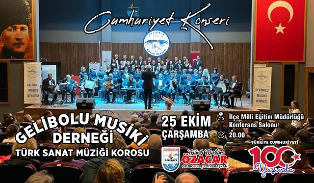 Gelibolu Belediyesi sosyal medya hesabından yapılan açıklamaya göre, Cumhuriyetimizin 100. Yılı kutlama etkinlikleri 25 Ekim 2023 – Çarşamba günü Gelibolu Musiki Derneği Türk Sanat Müziği korosunun İlçe Milli Eğitim Müdürlüğü konferans salonunda vereceği konser ile başlayacak.