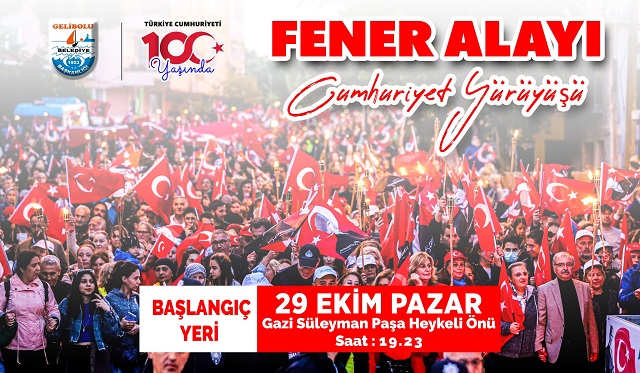 Gelibolu Belediyesi tarafından Cumhuriyetimizin 100. Yılı münasebetiyle gerçekleştirilen kutlama etkinliklerinin son günü olan 29 Ekim 2023 – Pazar günü ise Gazi Süleyman Paşa heykeli önünde saat 19.23’te başlayacak olan Fener Alayı yürüyüşü yapılacak. Aynı gün iskele meydanında gerçekleştirilecek olan Cumhuriyet Konserinin konuğu ise Kalben olacak ve kutlamalar sona erecek.