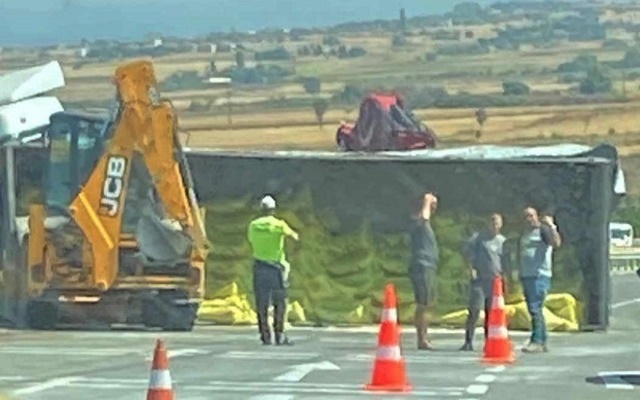 Bugün öğle saatlerinde meydana gelen trafik kazasında gübre yüklü kamyon, şoförünün direksiyon hakimiyetini kaybetmesi sonucu orta refüjü ve yolun bir şeridini kapatacak şekilde devrildi.