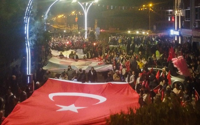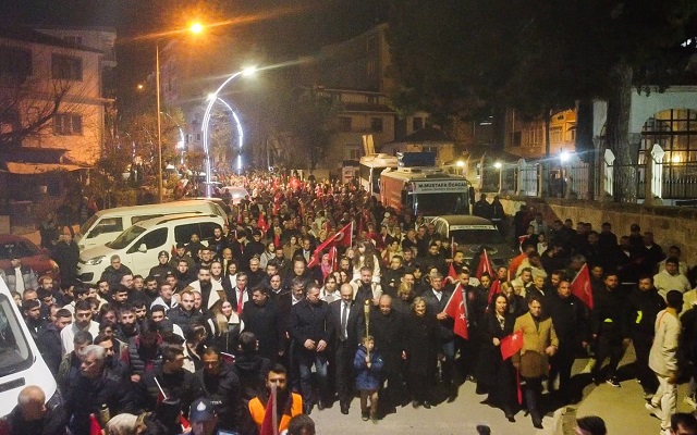 Meşaleler ellerde, Çanakkale türküsü dillerde, Gazi Süleyman Paşa meydanında başlayan yürüyüş, iskele meydanındaki Atatürk Anıtı’nda son buldu.