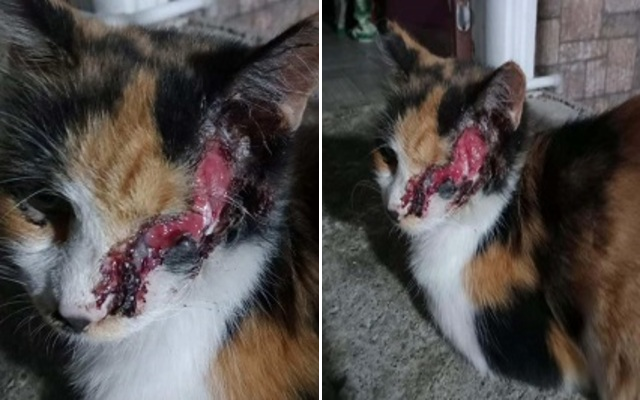 Belli ki ev kedisiyken sokaklara bırakılmış ve ama kediler ama köpekler tarafından saldırıya uğramış ve yüzünde açık yarası var, bir gözünü kaybetmiş. Yavrularında gözleri sıkıntılı, bakım yapılması gerekiyor.