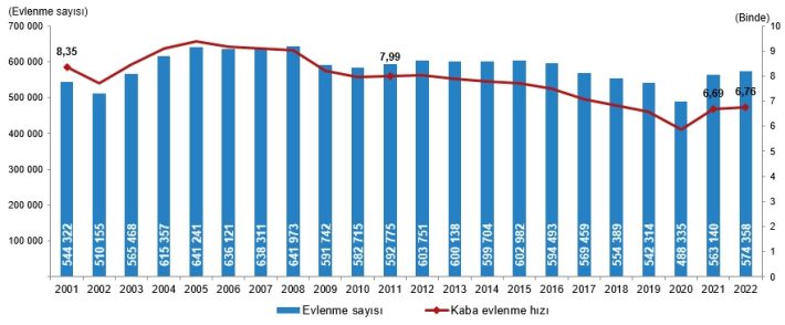 Evlenen çiftlerin sayısı 2021 yılında 563 bin 140 iken 2022 yılında 574 bin 358 oldu. Bin nüfus başına düşen evlenme sayısını ifade eden kaba evlenme hızı 2022 yılında binde 6,76 olarak gerçekleşti.