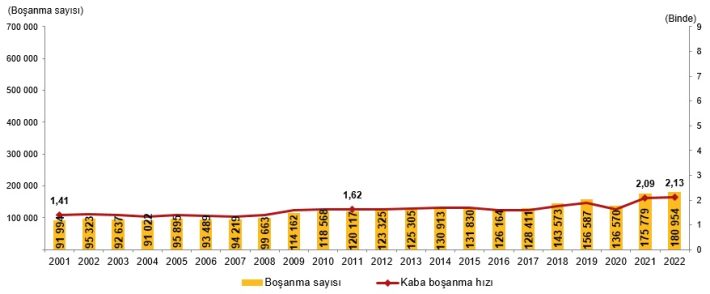 Boşanan çiftlerin sayısı 2021 yılında 175 bin 779 iken 2022 yılında 180 bin 954 oldu. Bin nüfus başına düşen boşanma sayısını ifade eden kaba boşanma hızı 2022 yılında binde 2,13 olarak gerçekleşti.