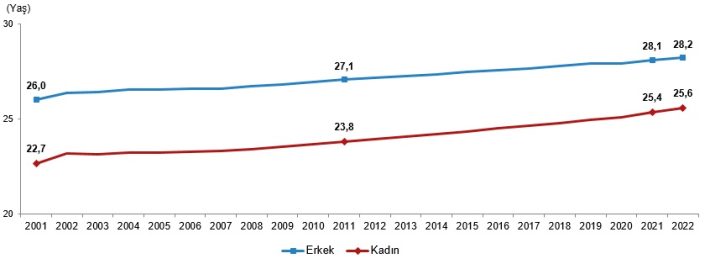 Yıllara göre ortalama ilk evlenme yaşı incelendiğinde, her iki cinsiyette de ilk evlenme yaşının arttığı görüldü. Ortalama ilk evlenme yaşı 2022 yılında erkeklerde 28,2 iken kadınlarda 25,6 oldu. Erkek ile kadın arasındaki ortalama ilk evlenme yaş farkı ise 2,6 yaş olarak gerçekleşti.