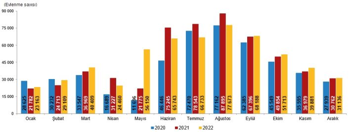 Evlenme sayısı aylara göre incelendiğinde, evlenme sayısının 2022 yılı Nisan ayında bir önceki yılın aynı ayına göre azaldığı görüldü. Evlenme sayısının Nisan ayında Ramazan ayının etkisiyle azaldığı görülürken Mayıs ayında artığı görüldü. Evlenme sayısı 2022 yılı Nisan ayında 24 bin 460 iken 2,3 kat artarak Mayıs ayında 56 bin 150 oldu.