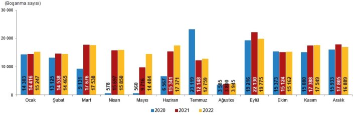 TÜİK verilerine göre boşanma sayısı aylara göre incelendiğinde, adli tatil nedeniyle Ağustos ayında önemli bir azalma görüldü. Boşanma sayısı, 2022 yılının Ağustos ayında 3 bin 945 iken adli tatil sonrası Eylül ayında 5,0 kat artarak 19 bin 775 oldu.