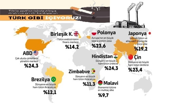 Tütün Endüstrisi Devleri İçmiyor, Türkiye İçiyor Dünya tütün piyasasına yön veren ülkeler, üretimin ve finansın merkezi olsalar da tüketim karnesinde Türkiye’nin gerisinde kalıyor. Sigara üretiminin büyük ölçüde çok uluslu şirketler tarafından yapıldığı Türkiye’de, tütün tüketimi yaygın bir alışkanlık haline geliyor. Teknolojik dönüşümün öncüsü Japonya veya Avrupa’nın üretim üssü konumundaki Polonya gibi ülkelerde dahi toplumlar, “Türk gibi” içmiyor. Türkiye’de kişi başına düşen günlük ortalama 17,8 adetlik tüketim miktarı, ülkemizi en yoğun içici kitlesine sahip ülke konumuna taşıyor.