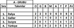 A-Grubu: İtalya (3) İsviçre (0) – Türkiye (0) Galler (2)