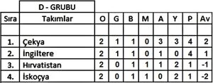 D-Grubu: Hırvatistan (1) Çekya (1) – İngiltere (0) İskoçya (0)