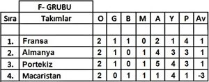 F-Grubu: Macaristan (1) Fransa (1) – Portekiz (2) Almanya (4)